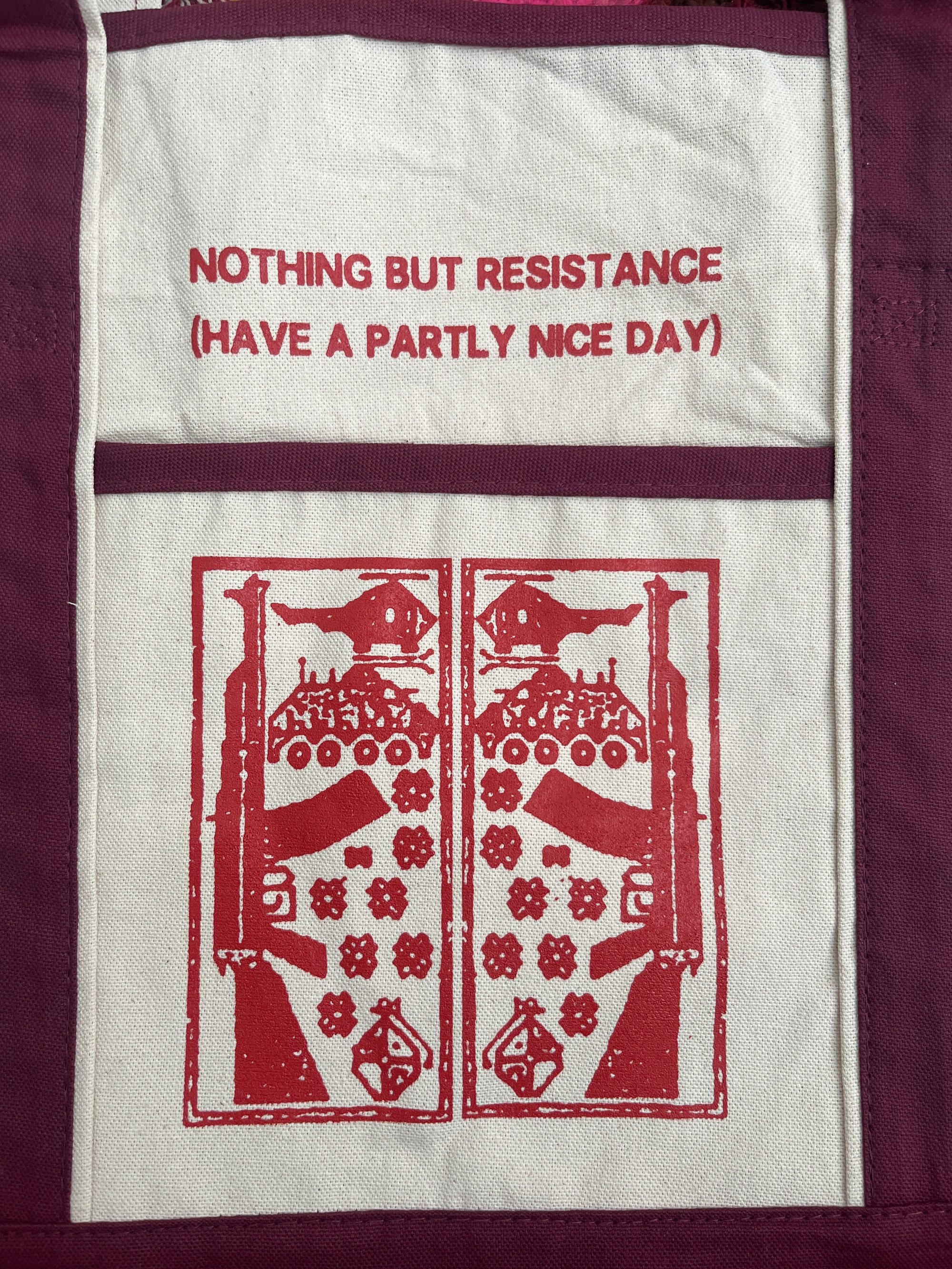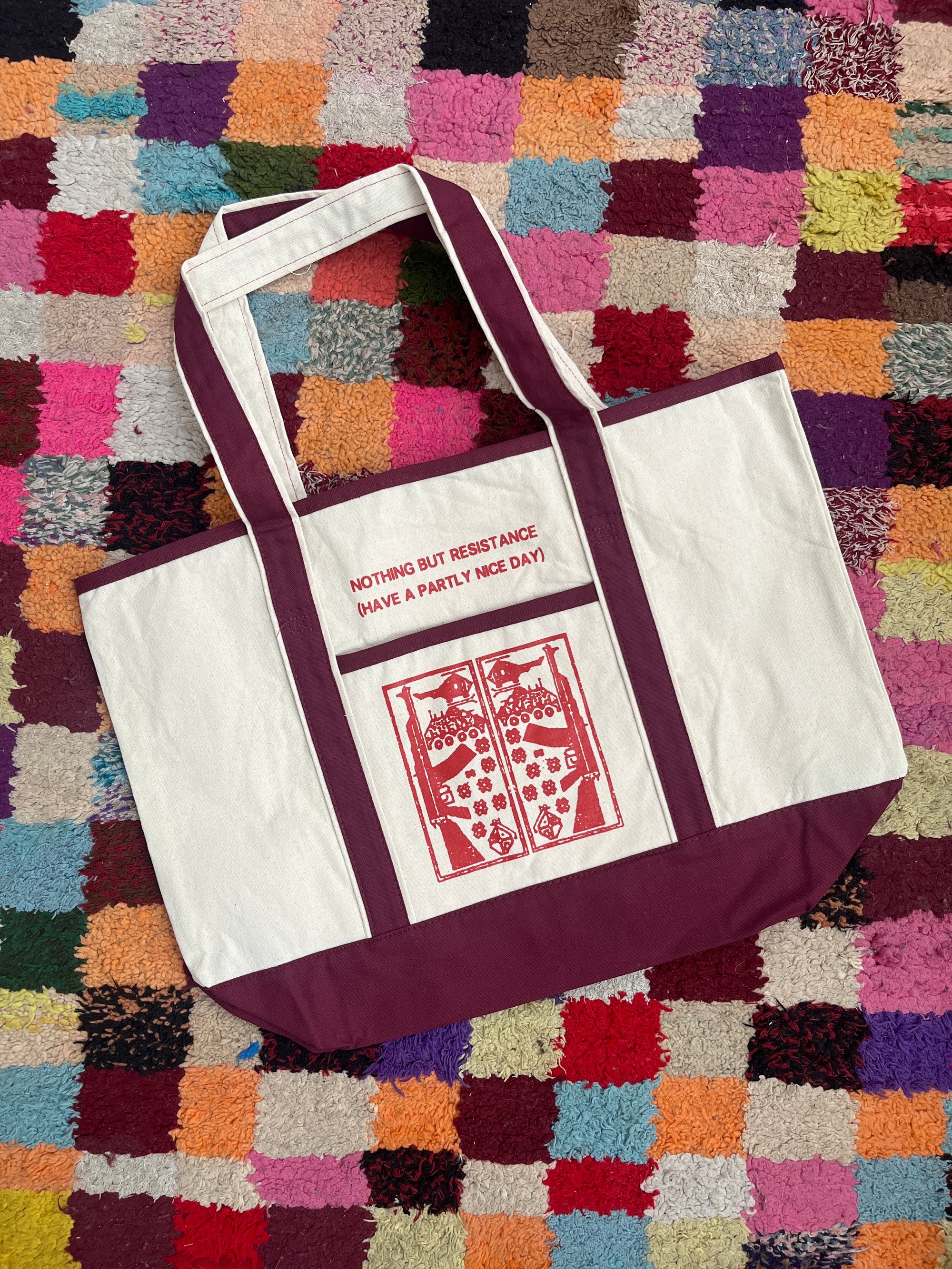 Oversized tote with extra outer pocket and one small zip up interior pouch, 12” record for size reference. Printed locally by our pals at Grilka Press. $6 from the sale of each tote go to supporting a family in Gaza.
